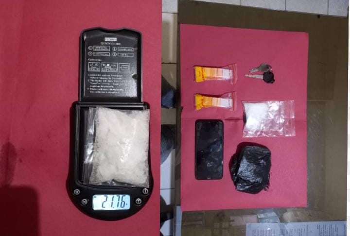 “Saat penggeledahan tersebut di temukan barang bukti sebanyak: 1 (satu) bungkus plastik bening yang berisikan kristal warna putih diduga narkotika jenis Shabu yang dilapisi dengan 1 (satu) bungkus plastik strip bening ukuran besar dengan berat bruto 21.76 gr ,2 (dua) bal plastik strip bening, 1 (satu) unit handphone merek REALME warna hitam, 1 (satu) buah kantong plastik warna hitam dan 1 (satu) unit sepeda motor merek Honda Scoopy warna abu-abu”,Ujar KBO.