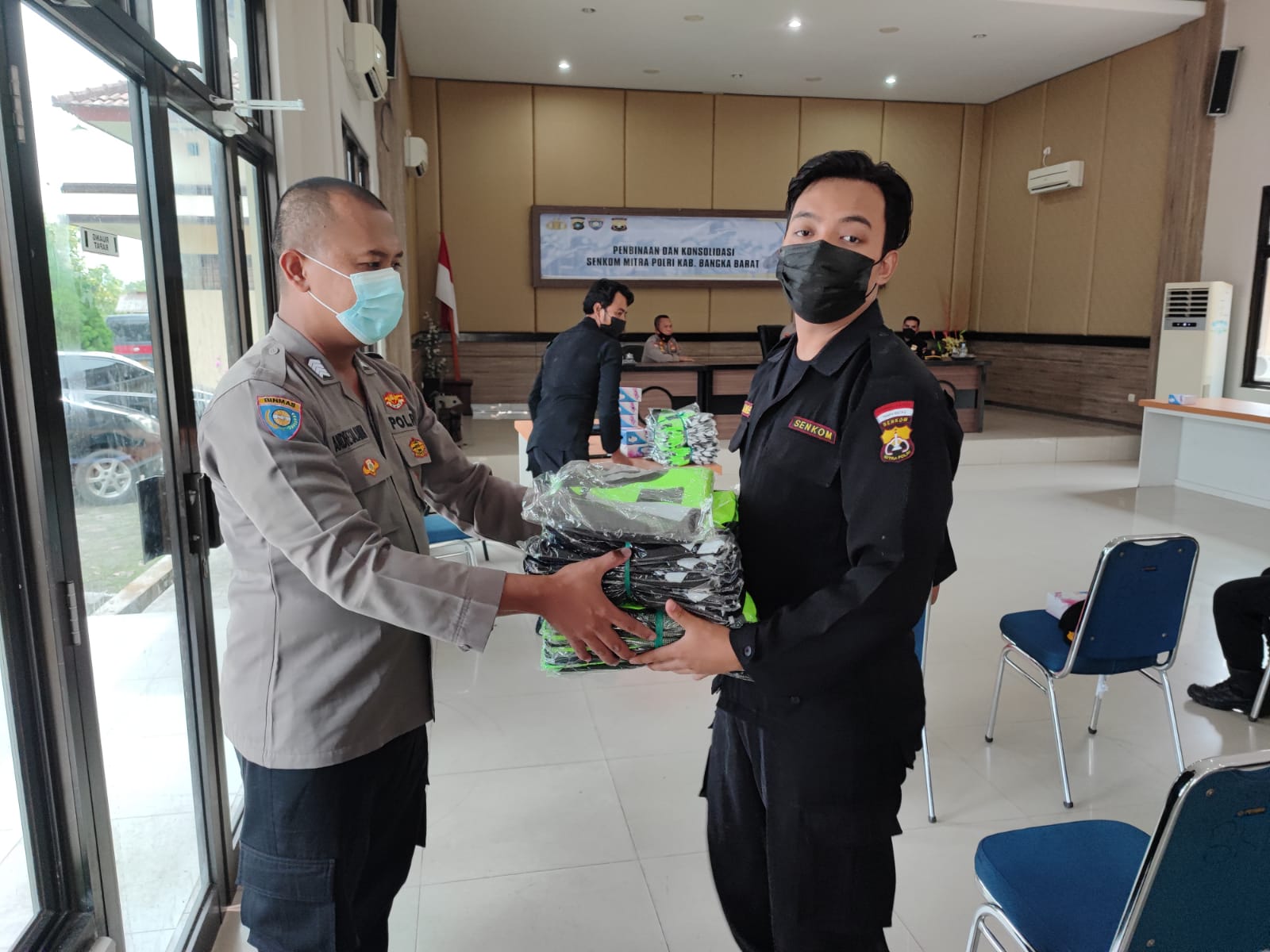Dilanjutkan kegiatan simbolis pemasangan dan penyerahan rompi kepada Senkom Mitra Polri Kab. Bangka Barat, Beliau menuturkan dan salut atas kerja keras para pengurus yang selalu bisa sinergi dengan pemerintah Polres Bangka Barat. Hal ini terbukti bisa sukses melaksanakan kegiatan pembinaan lebih dari 37 personil.