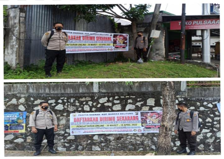 Bangka Barat| Jejakkriminal.com-Polres Bangka Barat memasang spanduk yang berisi sosialisasi tentang Pendaftaran / penerimaan calon anggota Polri mulai dari Taruna Akademi Polisi (Akpol), Bintara Polri dan Tamtama Polri, Minggu (03/04/2022).Pemasangan spanduk / banner yang berisi sosialisasi tentang Penerimaan Anggota Polri ini di pasang ditempat- tempat yang sangat strategis salah satunya yaitu di Simpang Lampu merah kp senang hati, mengingat jalan tersebut ramai dilalui oleh masyarakat pengguna jalan.” Sosialisasi juga kita libatkan semua mulai dari polres dan Polsek Jajaran . sehingga diharapkan banyak warga yang mengetahui dan mengerti tentang penerimaan anggota Polri ini dan syarat – syarat apa yang harus dipenuhi serta mengerti bahwa perekrutan tersebut tidak di pungut biaya atau gratis, ” ucap Kabag Sumda Polres Bangka Barat AKP Surtan Sitorus SH seizin Kapolres Bangka Barat AKBP Agus Siswanto S.H., S.I.K., M.H.