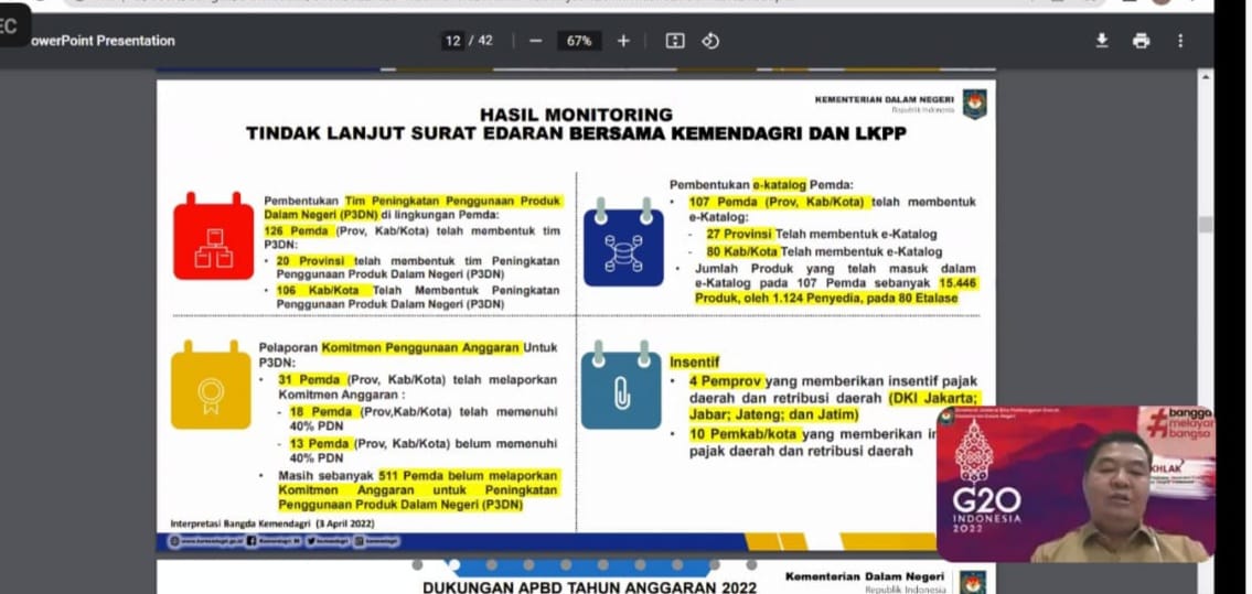 Teguh menjelaskan, bahwa saat ini telah dikakukan pembentukan Tim Peningkatan Penggunaan Produk Dalam Negeri (P3DN) di lingkungan Pemda, terdiri dari 126 Pemda, baik Pemprov maupun Pemkab/Pemkot, dengan rincian P3DN di 20 Provinsi dan 106 Kab/Kota.