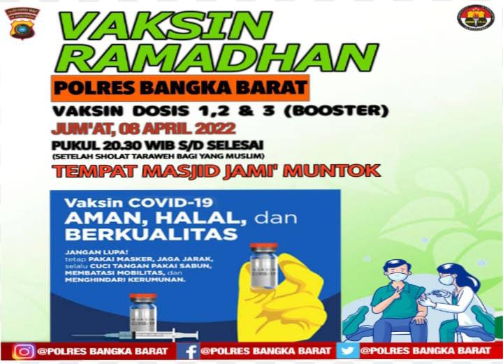 Kapolres Bangka Barat menjelaskan gerai vaksin Ramadan Polres Bangka Barat buka mulai pukul 20.30 wib s/d selesai dan syarat untuk vaksin adalah membawa foto kopi KK dan KTP serta foto kopi sertifikat vaksin sebelumnya.