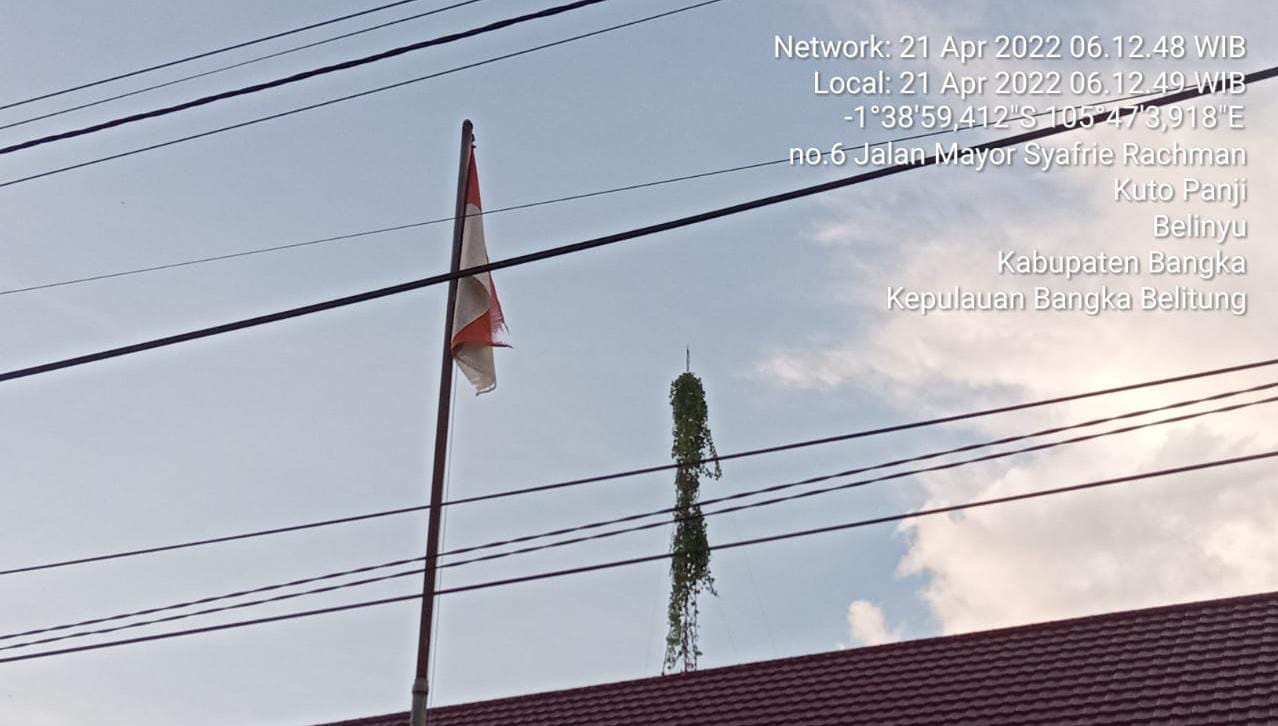 Hasil pantauan Awak media Kamis (21/04/2022) Pukul 06.12 Wib terlihat Pengibaran Bendera Merah putih keadaan yang sobek dan sangat Kusam .Pemandangan terlihat di halaman kantor Camat Belinyu Jalan Mayor Syafrie Rahman,Kuto Panji, Belinyu, Kabupaten Bangka, Provinsi kepulauan Bangka Belitung , yang tidak patut untuk menjadi contoh yang tidak baik, Terlihat jelas Berkibarnya Lambang Negara Bendera sang saka Merah putih yang sudah Robek dan Kusam Terkesan ada Pembiaran dan sangat memalukan.
