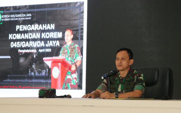 Pangkalpinang| Jejakkriminal.com- Menjelang perayaan Hari Raya Idul Fitri 1443 H /2022 M Danrem 045/Garuda Jaya Brigjen TNI Ujang Darwis, MDA memberikan pengarahan (Jam Komandan) kepada prajurit dan PNS Makorem serta Satuan Badan Pelaksana Korem (Satbakakrem) Senin 25/04/2022 di Aula Makorem.