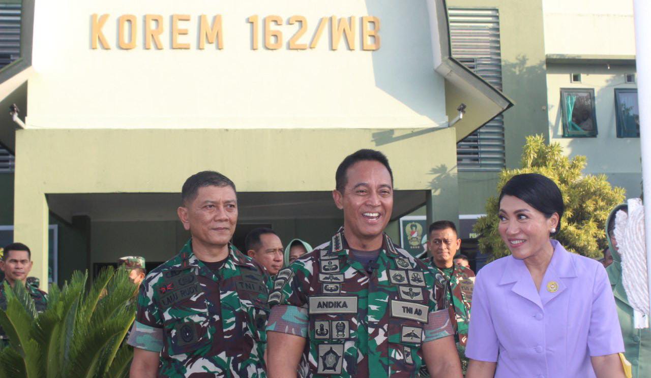 Mataram| Jejakkriminal.com – Panglima TNI Jenderal TNI Andika Perkasa, S.E., M.A., M.Sc., M.Phil, Ph.D dan Ketua Umum Dharma Pertiwi Ny. Hetty Andika Perkasa beserta rombongan melaksanakan Kunjungan Kerja (Kunker) di Provinsi NTB untuk melaksanakan pembukaan dan Kirab dari para peserta Latsitarda Nusantara XLVII tahun 2022 di Kota Mataram.Setibanya di Makorem 162/WB pada Jumat (13/05/2022), Panglima TNI beserta rombongan disambut langsung oleh Pangdam IX/Udayana Mayjen TNI Sonny Aprianto, S.E., M.M., didampingi Danrem 162/WB Brgjen TNI Lalu Rudy Irham Srigede, S.T., M.Si., dengan pengalungan bunga yang diiringi Drum Band Canka Wirayudha.