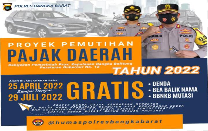Bangka Barat| Jejakkriminal.com-Polres Bangka Barat himbau warga untuk mengikuti pemutihan pajak kendaraan yang akan berakhir 29 juli 2022. Perihal tersebut dikatakan Kapolres Bangka Barat AKBP Agus Siswanto S.H., S.I.K., M.H program tersebut yang berjalan sejak mulai bulan April hingga akhir bulan Juli 2022 mendatang. Selasa (17/05/2022)