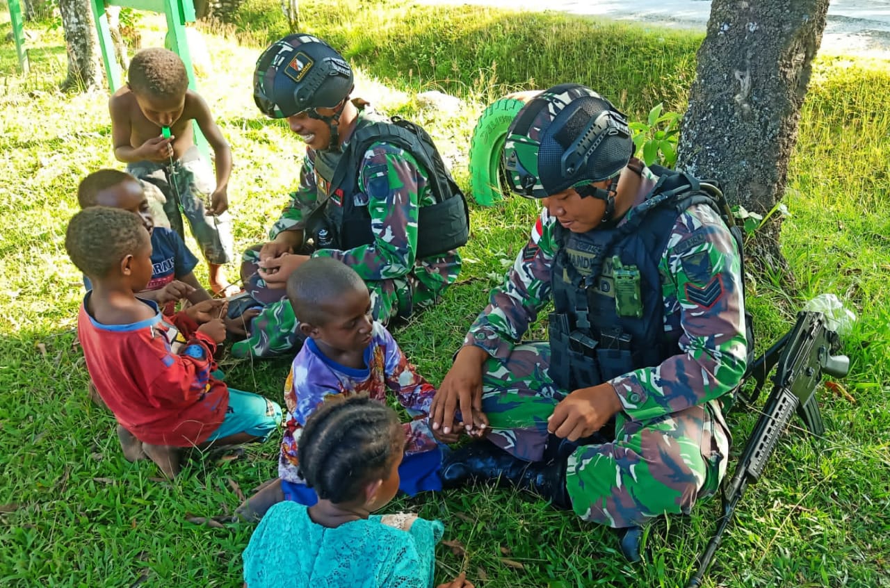 Yalimo| Jejakkriminal.com-Satgas Yonif Raider 142/KJ mempunyai cara tersendiri mengajak anak-anak untuk bermain bersama di depan pos Kotis Elelim, Distrik Elelim, Kab Yalimo, Papua, Selasa (31/05/2022)