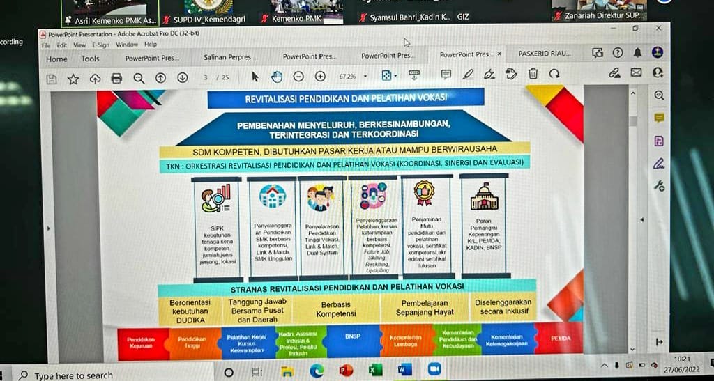 PEKANBARU| Jejakkriminal.com — Direktur Sinkronisasi Urusan Pemerintahan Daerah IV, Zanariah hadir melalui virtual (online) pada Sosialisasi dan Penyusunan Tindak Lanjut Perpres Nomor 68 Tahun 2022 tentang Revitalisasi Pendidikan dan Pelatihan Vokasi, yang diselenggarakan oleh Kemenko bidang Pembangunan Manusia dan Kebudayaan pada hari Senin tanggal 27 Juni 2022, pukul 09.00 s.d. 12.30 WIB.
