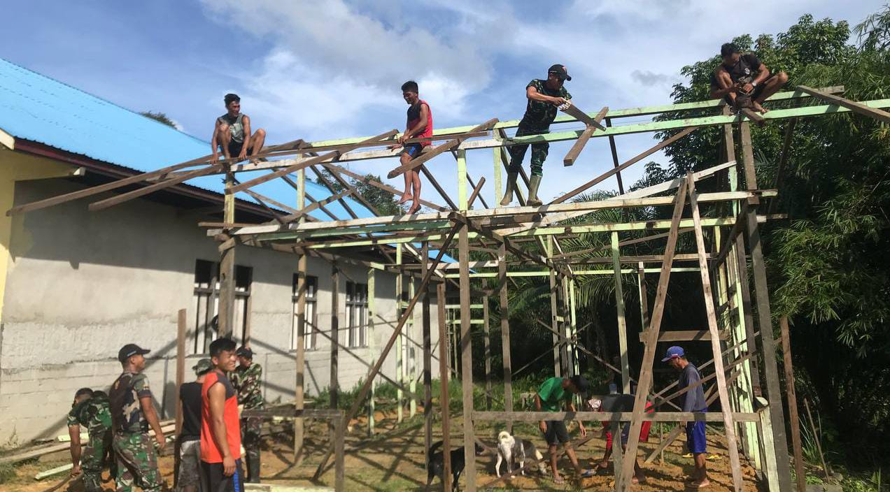 SINTANG| Jejakkriminal.com – Guna membantu dan menumbuhkan kedekatan kepada masyarakat, personel Satgas Pamtas Yonarmed 19/105 Trk Bogani Pos Muakan yang dipimpin oleh Sertu Manurung beserta 7 anggota bergotong royong bersama masyarakat desa membangun gereja di Desa Muakan Petinggi, Kecamatan Senaning, Kabupaten Sintang. (Senin, 27 Juni 2022)