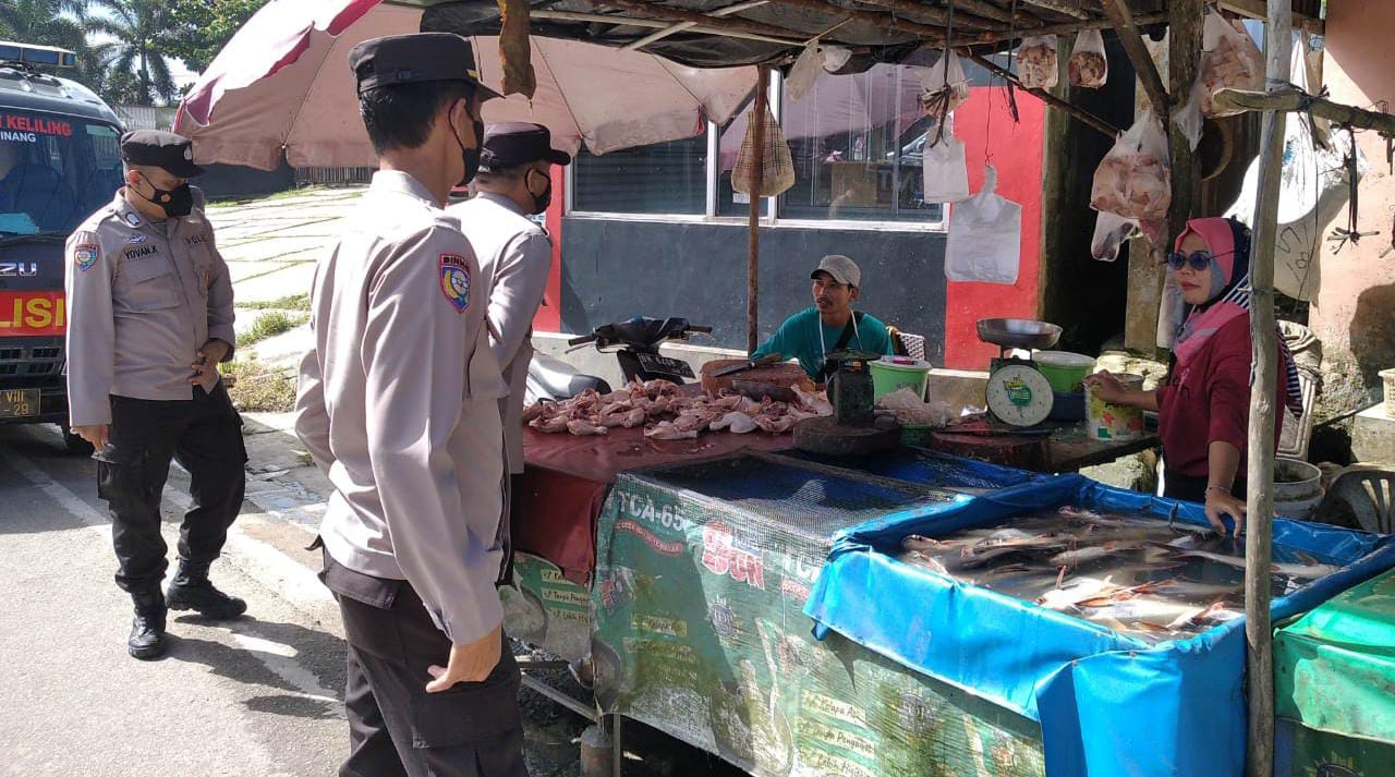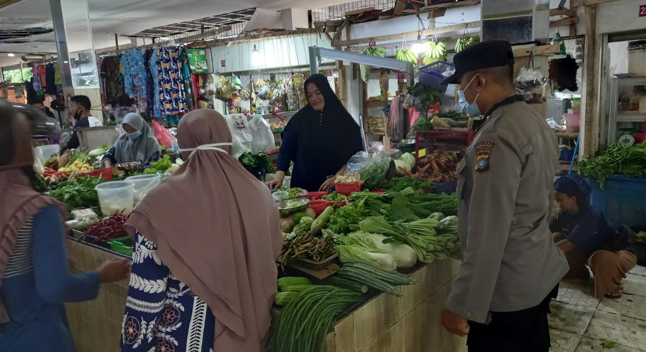 Personil Satgas Mobilisasi dan Edukasi yang dipimpin IPDA Ida Artha S.H melaksanakan patroli berjalan kaki dan saling bertegur sapa dengan sejumlah pedagang kaki lima serta warga masyarakat di Pasar Kerabut untuk mengingatkan tentang disiplin protokol kesehatan.