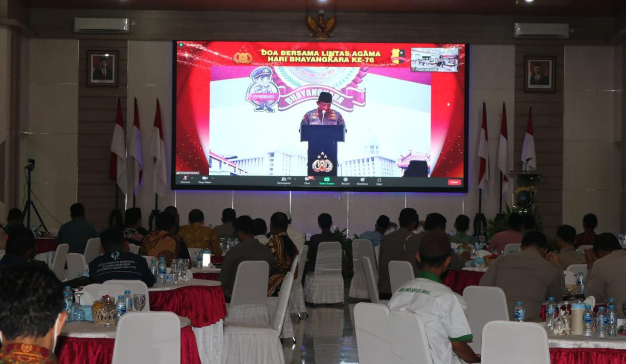 Kapolri dalam sambutannya mengatakan acara do’a bersama lintas agama dalam memperingati HUT Bhayangkara ke-76 adalah untuk mempererat tali silaturahmi Polri bersama masyarakat dan untuk memperkuat kebersamaan dalam berbangsa dan negara, sesuai dengan tema Hari Bhayangkara ke-76 tahun 2022 yaitu *Polri Yang Presisi Mendukung Pemulihan Ekonomi dan Reformasi Struktural Untuk Mewujudkan Indonesia Tangguh, Indonesia Tumbuh.*
