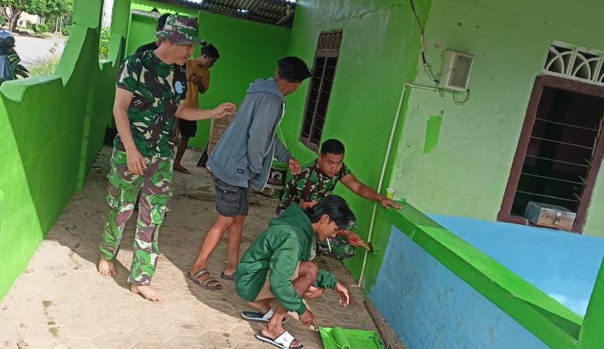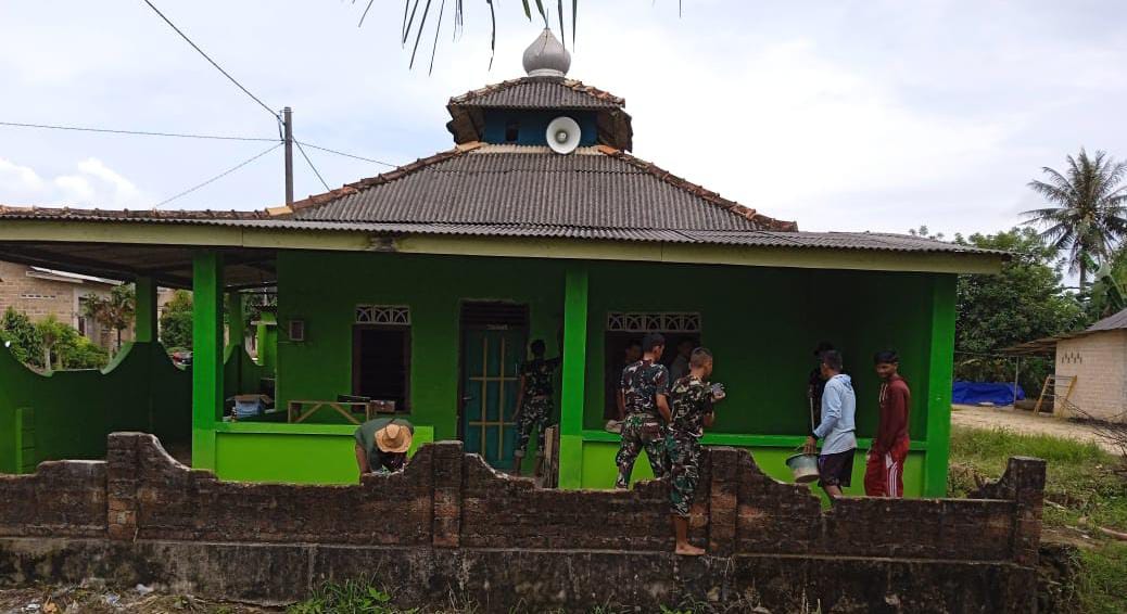 Terpantau, sejumlah sejumlah warga setempat bersama Satgas TMMD sedang melakukan pengecatan dinding mushola dan ini merupakan Musholla satu- satunya yang ada di duaun Sukamaju.