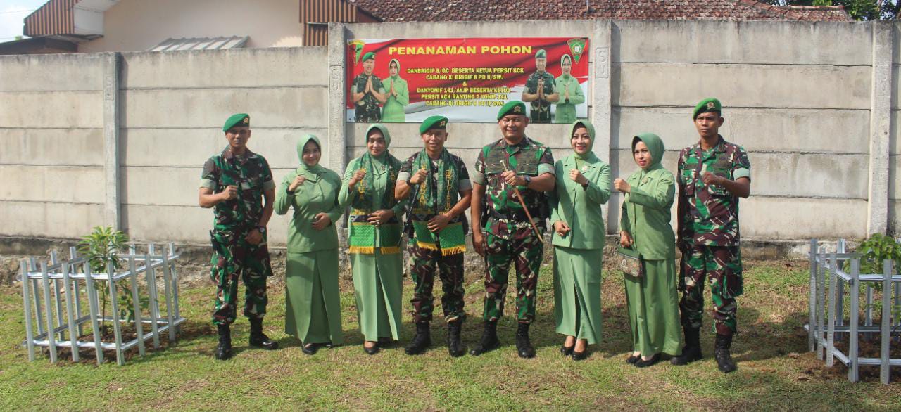 Guna menciptakan lingkungan yang asri, Danbrigif 8/Garuda Cakti didampingi Ketua Persit KCK Cabang XI Brigif 8 disaksikan oleh seluruh prajurit dan Persit Yonif 141/Aneka Yudha Jaya Prakosa melakukan Penanaman Bibit Pohon.