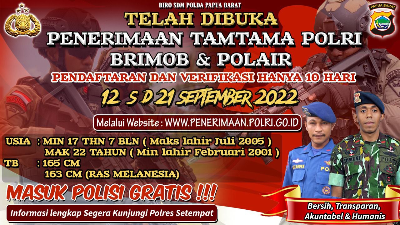 Sorong Papua Barat| jejakkriminal.com – Kepolisian mulai membuka pendaftaran Tamtama Polri gelombang I T.A 2022 pada 12-21 September 2022. Pendaftaran dapat dilakukan secara online melalui situs penerimaan.polri.go.id.