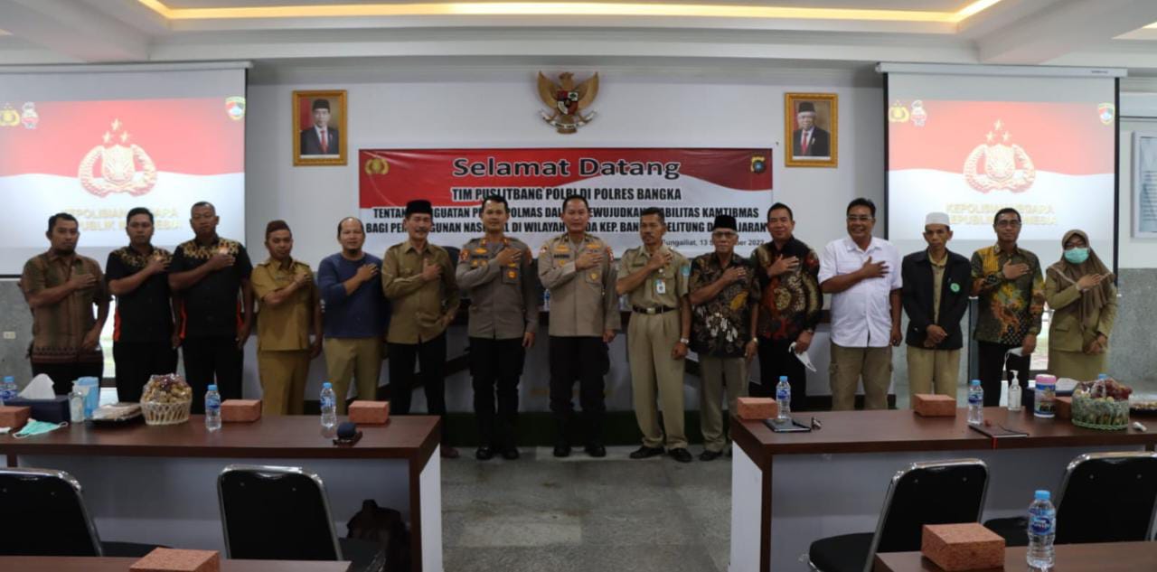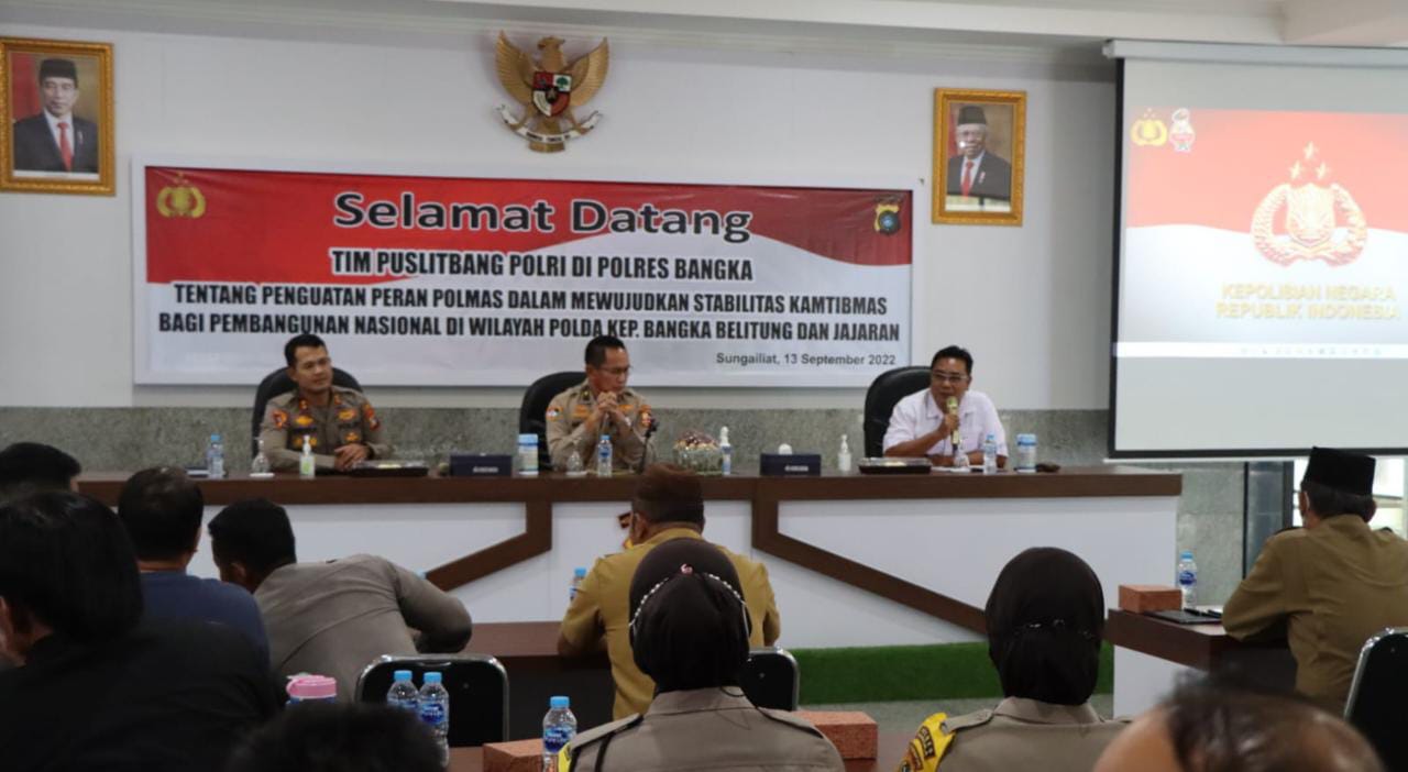Sungailiat| Jejakkriminal.com – Polres Bangka terima kunjungan Tim Puslitbang Polri dalam rangka Pelaksanaan Penelitian Tentang Penguatan Peran Polmas dalam Mewujudkan Stabilitas Kamtibmas bagi Pembangunan Nasional di Aula Tribrata.Selasa (13/9/2022)