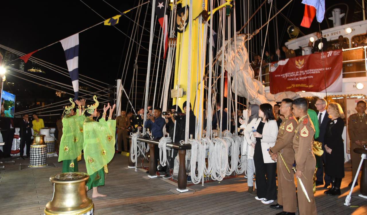 Dihari ketiga sandar di Australia, Selasa (13/9), KRI Bima Suci dengan Komandan Letkol Laut (P) M. Sati Lubis, S.T, M.Sc., CHRMP., menggelar Cocktail Party yang berlangsung di atas KRI Bima Suci dengan menampilkan berbagai tarian dan hidangan khas Indonesia.