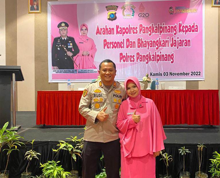 Pangkalpinang | Jejakkriminal.com – Kapolres Pangkalpinang AKBP Dwi Budi Murtiiono, S.I.K M.H, didampingi Ketua Bhayangkari Cabang Pangkalpinang Ny. Sary Dwi Budi memberikan arahan kepada personel dan Bhayangkari se-jajaran Polres Pangkalpinang.