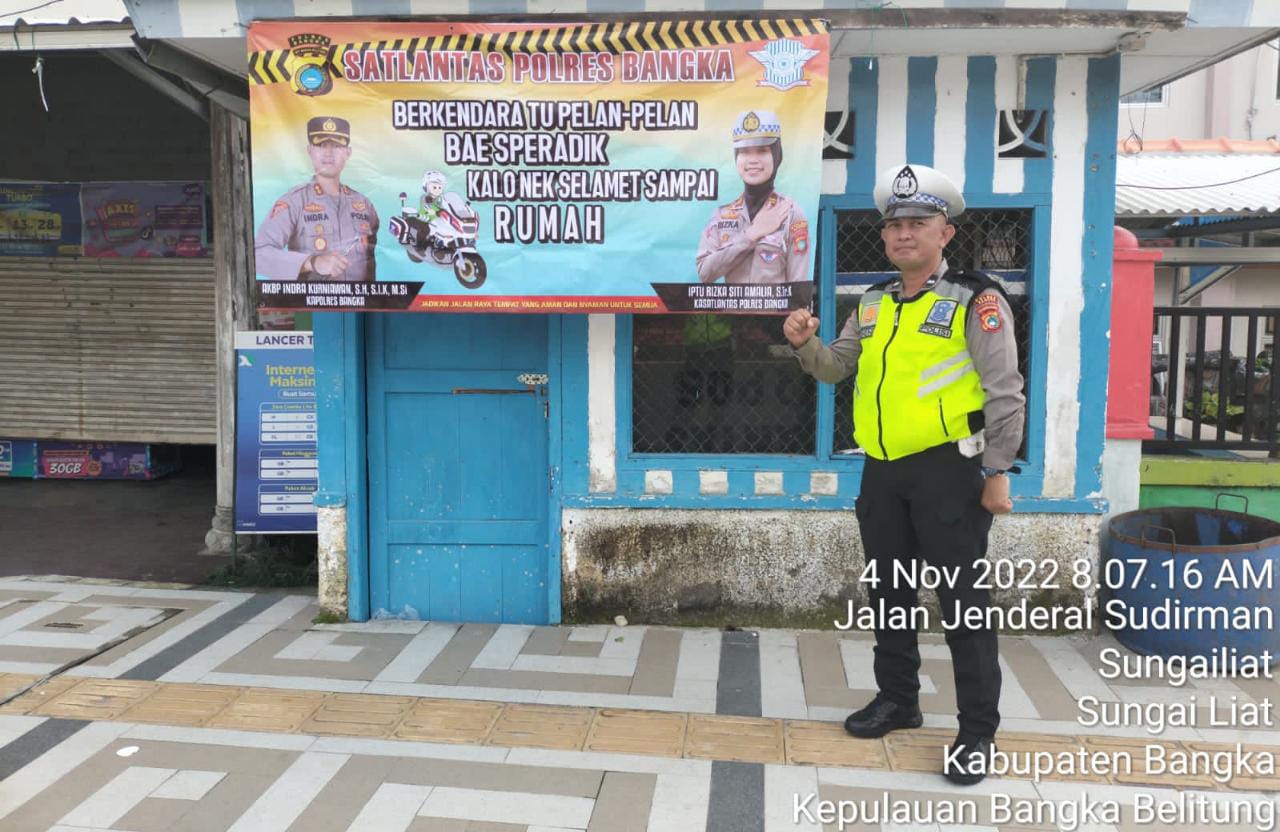 Sungailiat| Jejakkriminal.com – Dalam menjaga Kamseltibcar Lantas Sat lantas Polres Bangka melakukan Kegiatan Pemasangan Spanduk Himbauan . Jum’at (4/11/2022).