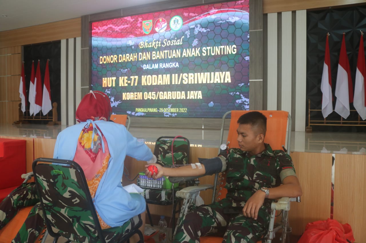 Pangkalpinang| Jejakkriminal.com- Dalam rangka memperingati HUT ke-77 Kodam II/Sriwijaya Korem 045/Garuda Jaya dan jajarannya menggelar Bhakti Sosial (Bhaksos) Donor Darah dan pemberian bantuan Anak Stunting Kamis 29/12/2022.