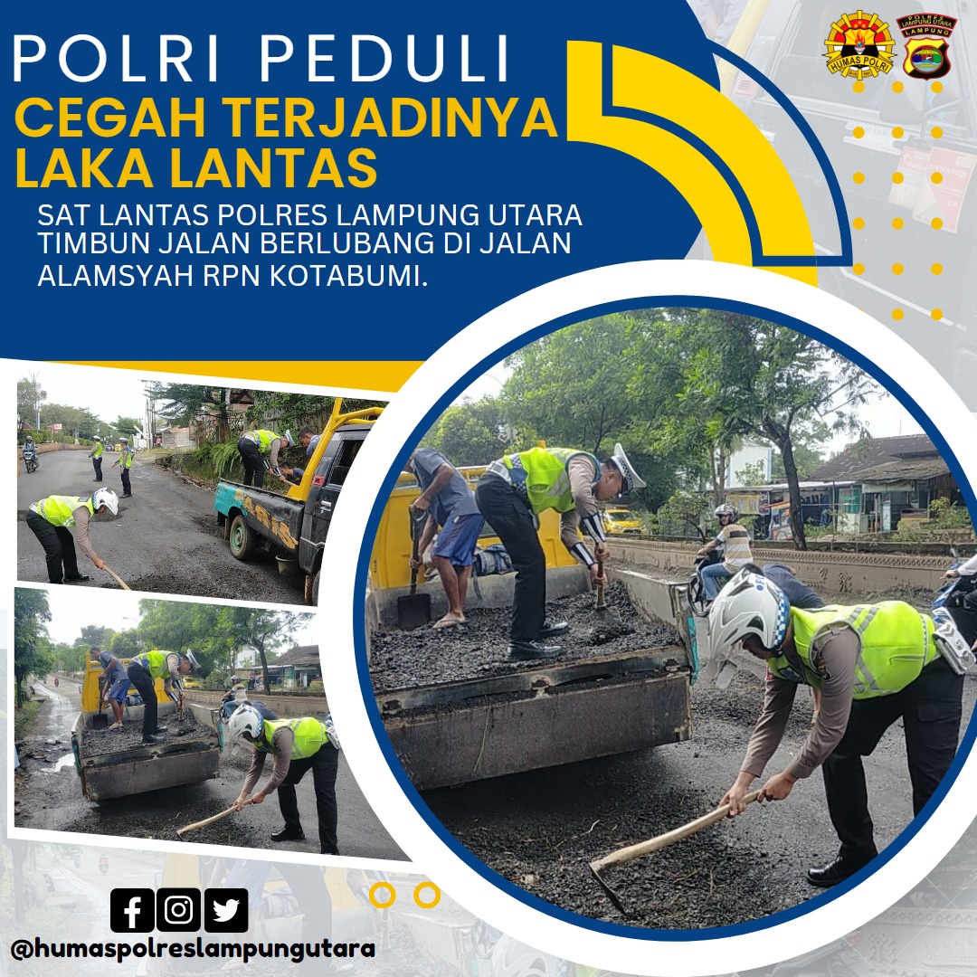 Kotabumi| Jejakkriminal.com-, Untuk mengantisipasi terjadinya kecelakaan lalu lintas, jajaran Satlantas Polres Lampung Utara Polda Lampung turut serta perbaiki Jalan berlubang yang berlokasi di jalan lintas tengah (Jalinteng) Kelapa Tujuh Kotabumi dengan melakukan penimbunan bersama warga sekitar lokasi. Selasa, 28/2/2023.