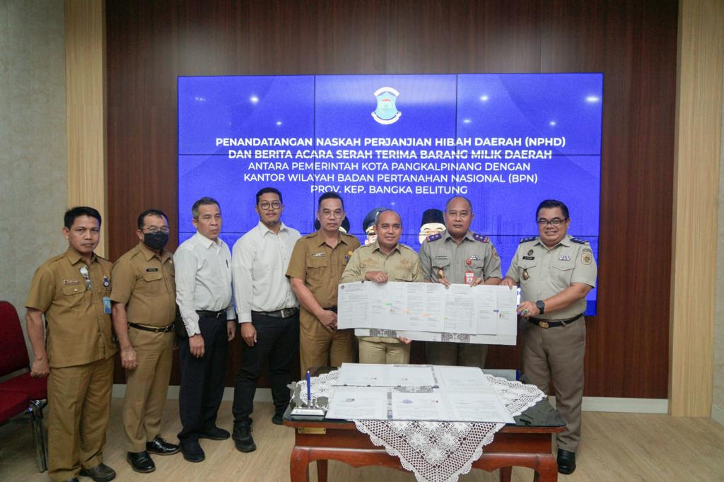 Pangkalpinang|jejakkriminal.com, -Penandatanganan Naskah Perjanjian Hibah Daerah (NPHD) dan berita acara serah terima barang milik daerah antara Pemerintah Kota Pangkalpinang dengan Kantor Wilayah Badan Pertanahan Nasional (BPN) Provinsi Kepulauan Bangka Belitung digelar bertempat di Smart Room Center Kota Pangkalpinang, Senin (20/03/2023).