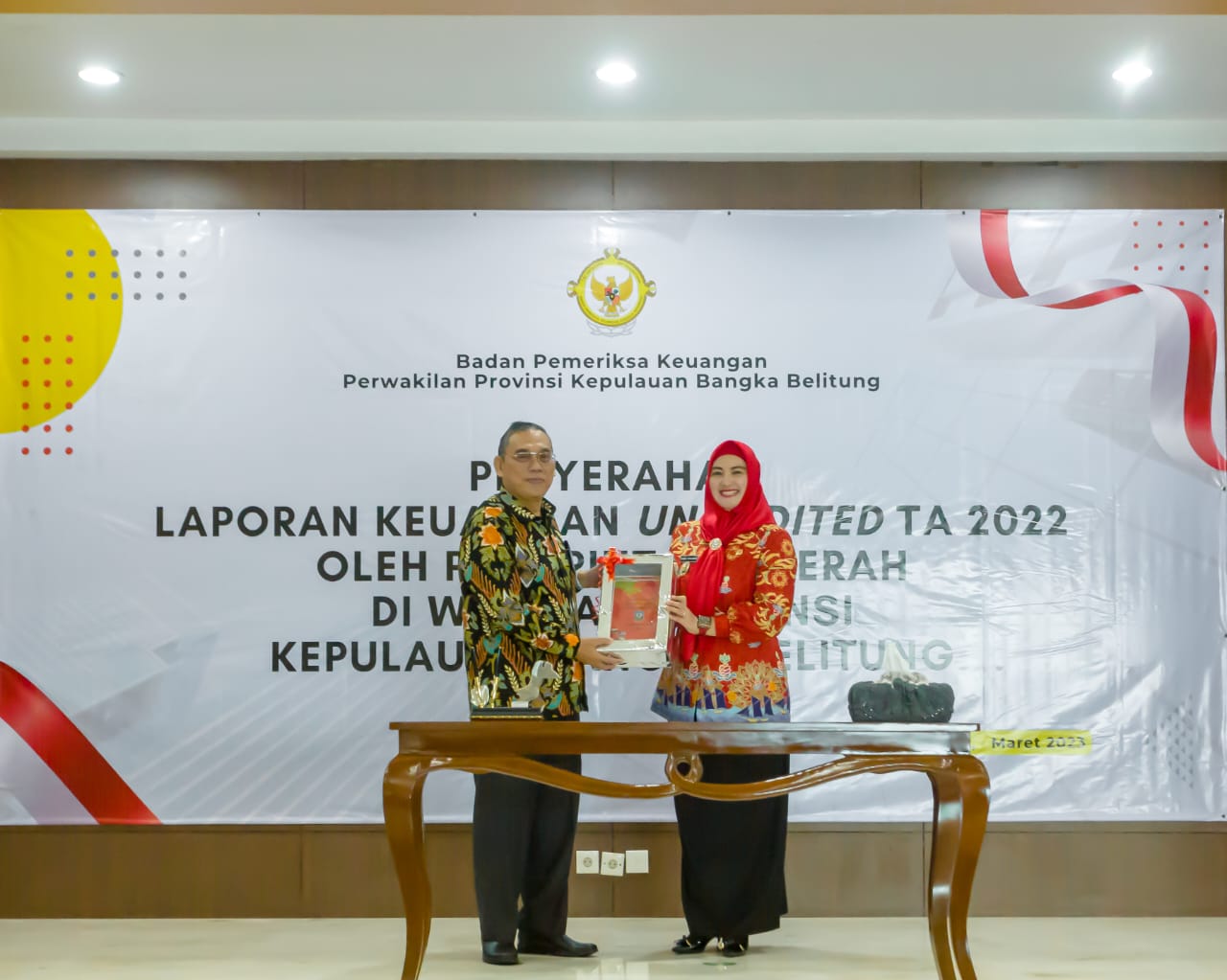 Toboali| Jejakkriminal.com  – Mewakili Bupati Bangka Selatan H. Riza Herdavid, S.T.,M.Tr.IP, Wakil Bupati Bangka Selatan Debby Vita Dewi, S.E menyerahkan Laporan Keuangan UNAUDITED Pemerintah Kabupaten Bangka Selatan Tahun Anggaran 2022 kepada Badan Pemeriksa Keuangan Republik Indonesia (BPK RI) Perwakilan Provinsi Kepulauan Bangka Belitung, Kamis (30/3/23).