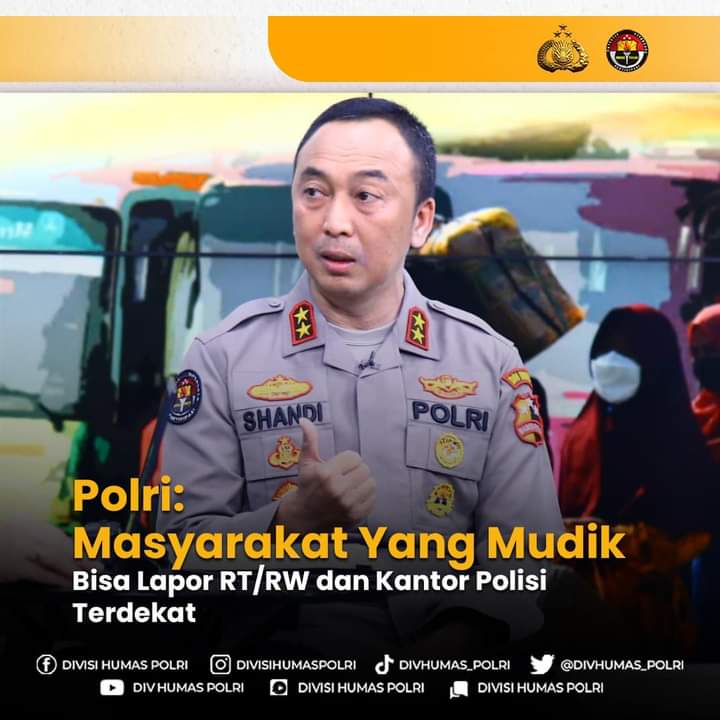 Kepala Divisi Humas Polri, Irjen Pol. Dr. Sandi Nugroho, S.I.K., S.H., M.Hum., mengimbau masyarakat yang mudik untuk memberitahukan kepada RT/RW, serta kantor Polisi terdekat untuk mengantisipasi tindak kejahatan selama meninggalkan rumah untuk sementara waktu.