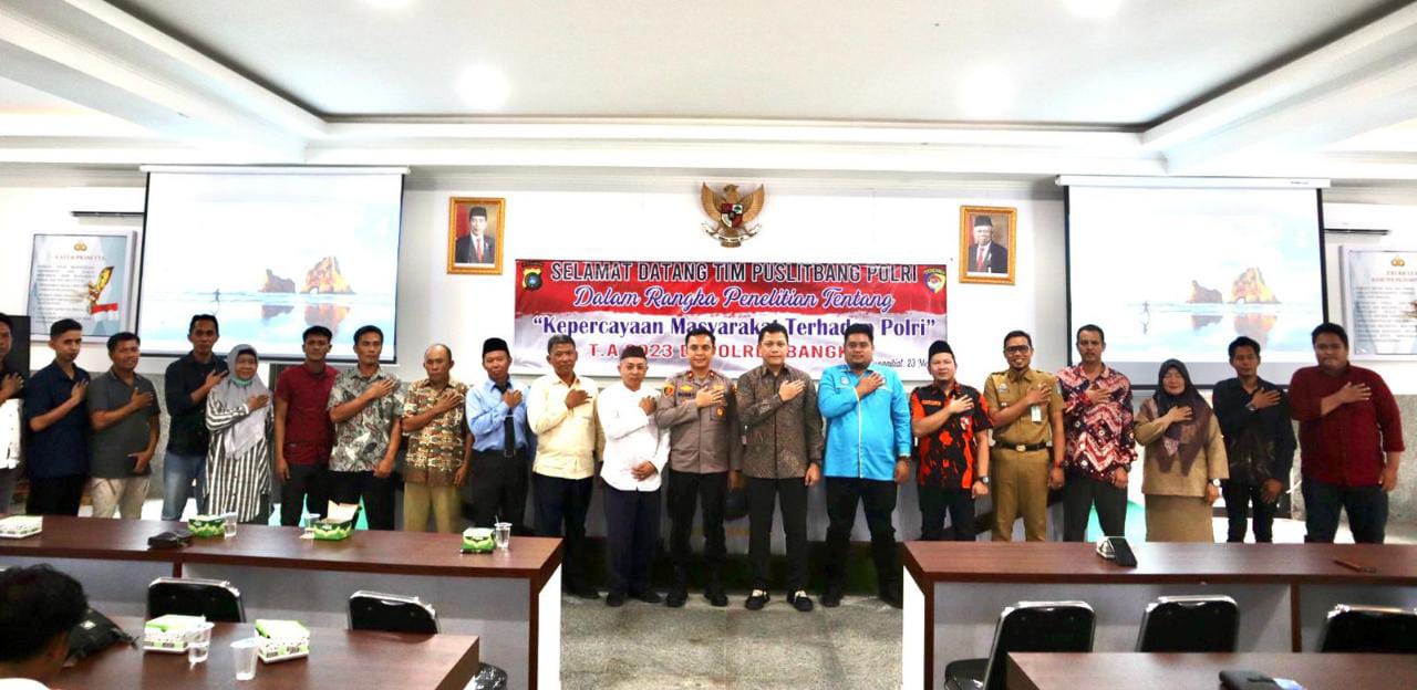 Dalam kegiatan tersebut dihadiri oleh Kasat Reskrim, Kasat Intel Kasat Lantas, Kasat Binmas, Kasat Samapta, Kasi Was, Tokoh Agama, Tokoh masyarakat, Tokoh Pemuda, Lsm/ Komonitas, para pelajar dan personil Polres Bangka.Dikesampatan kegiatan ini Waka Polres Bangka Kompol Robby Ansyari, S.I.K., mengucapkan selamat datang kami kepada Tim Puslitbang Polri di Polres Bangka.
