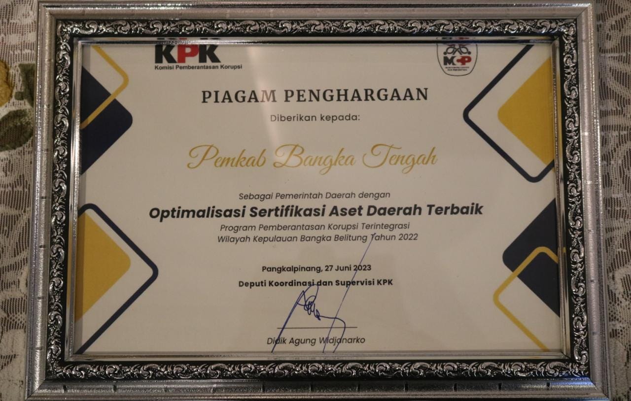 Penyerahan penghargaan ini juga turut disaksikan langsung oleh Didik Agung Widjanarko selaku Deputi Koordinasi dan Supervisi KPK serta Suganda Pandapotan Pasaribu selaku Pj. Gubernur Provinsi Kepulauan Bangka Belitung di Ruang Rapat Pasirpadi Kantor Gubernur, Selasa (27/06/2023).Algafry mengatakan prestasi yang diberikan untuk Pemerintah Kabupaten Bangka Tengah ini adalah suatu ikhtiar untuk menata dan menginvetaris aset-aset yang dimiliki oleh pemerintah