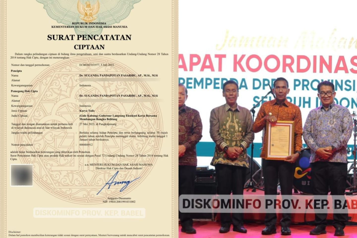 PANGKALPINANG| Jejakkriminal.com  – Pemerintah Provinsi (Pemprov) Kepulauan Bangka Belitung (Kep. Babel) menerima Sertifikat Hak Cipta Program Gubernur Langsung Eksekusi Kerja Bersama Membangun Bangka Belitung (Gule Kabung).