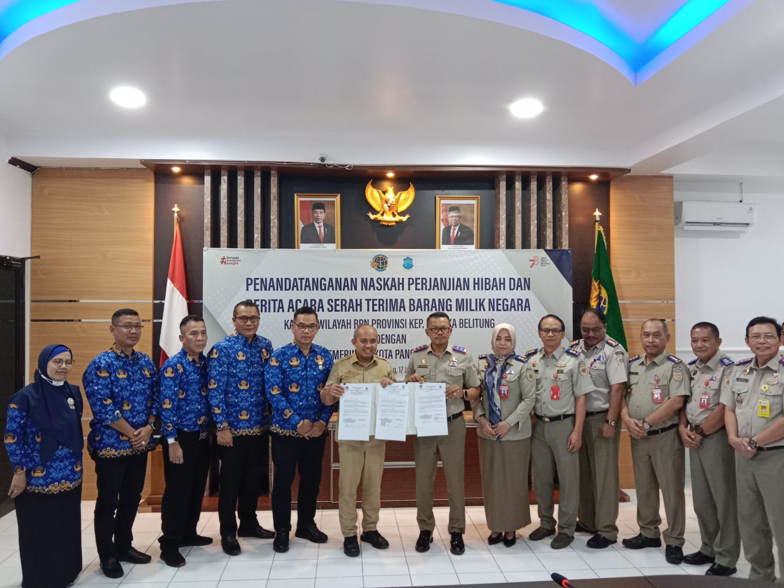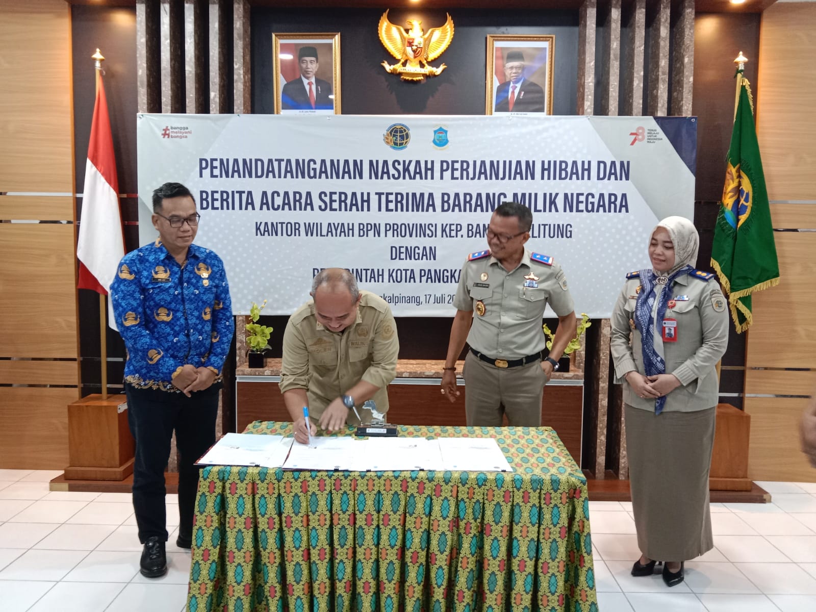 PANGKALPINANG| Jejakkriminal.com , – Wali Kota Pangkalpinang, Dr. H. Maulan Aklil atau yang akrab disapa Molen lakukan penandatanganan Naskah Perjanjian Hibah dan Berita Acara Serah Terima Barang Milik Negara di Kantor Wilayah Badan Pertanahan Nasional (BPN) Provinsi Kepulauan Bangka Belitung, Senin (17/7/2023).