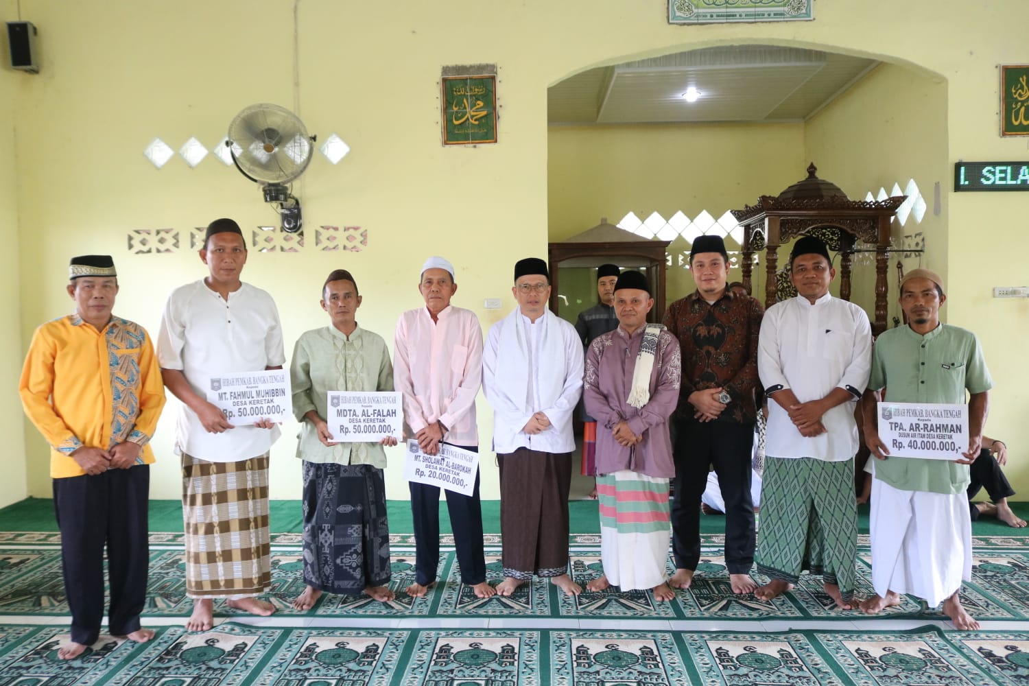 Usai salat, Algafry menyerahkan 20 paket sembako kepada masyarakat Dusun Air Itam, 1 buah water dispenser dan kipas angin kepada ketua dan pengurus Masjid Al Imam. Ia juga menyerahkan dana hibah kepada TPA Ar-Rahman Dusun Air Itam, Desa Keretak, sebesar Rp40.000.000,-, Madrasah Diniyah Takmiliyah Awaliyah (MDTA) Al-Falah Desa Keretak sebesar Rp50.000.000,-, Majelis Taklim Fahmul Muhibbin Desa Keretak sebesar Rp50.000.000,-, dan Majelis Taklim Sholawat Al-Barokah Desa Keretak sebesar Rp20.000.000,-.