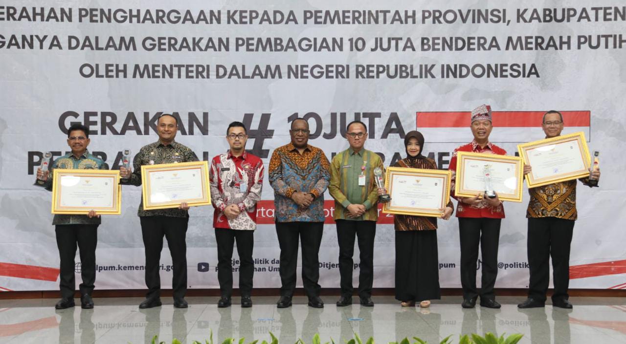 Penjelasan itu disampaikan Wempi saat memberi sambutan pada acara Penganugerahan Penghargaan kepada Pemerintah Provinsi, Kabupaten dan Kota atas Dukungannya dalam Gerakan Pembagian 10 Juta Bendera Merah Putih Tahun 2023 di Gedung Sasana Bhakti Praja, Kantor Pusat Kemendagri, Jakarta, Jumat (8/9/2023).