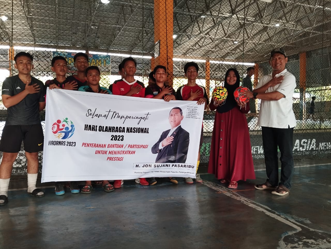 Pada momen peringatan Hari Olahraga Nasional (Haornas) ke-40 tahun ini, Drs H Jon Sujani Pasaribu, kembali berbuat aksi nyata bukan kata, yaitu dengan sumbangkan bola kepada dua Tim Futsal sembari gaungkan falsafah “Poda Na Lima” ke generasi muda, Selasa (12/9/2023)