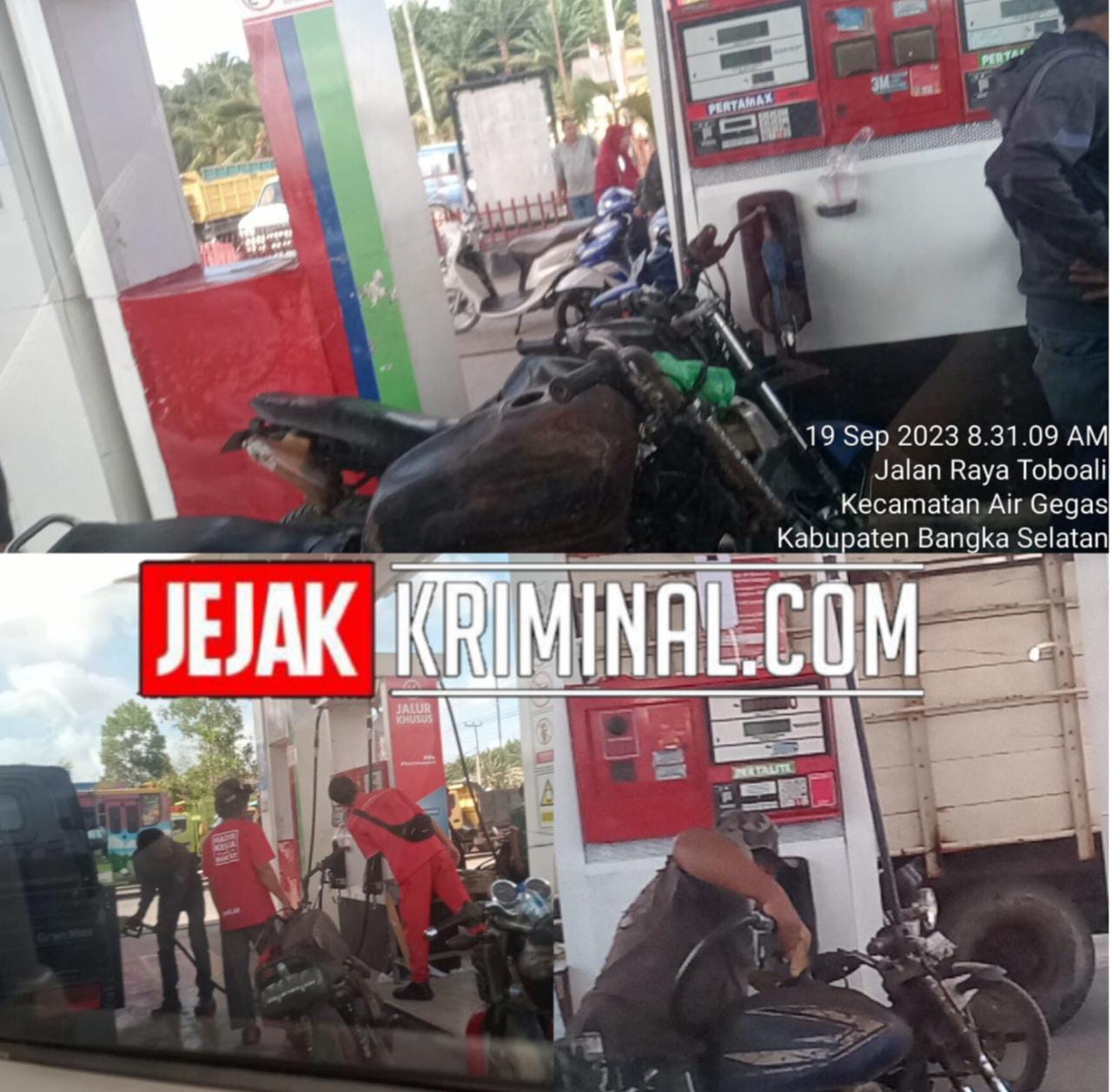Bangka Selatan| Jejakkriminal.com- Diduga SPBU 24.331.140 Jalan Raya Toboali,Desa Air Gegas,Kecamatan Air Gegas, Kabupaten Bangka Selatan , Provinsi kepulauan Bangka Belitung. Melayani Pengerit Dengan Sepada Motor tengki Modifikasi.