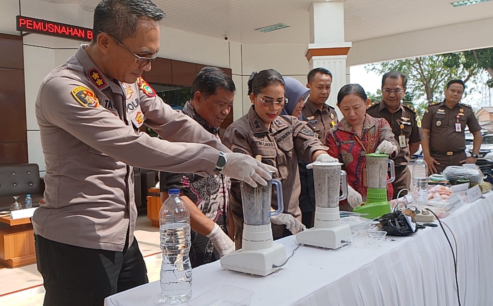 Barang bukti yang dimusnahkan berasal dari 92 kasus yang telah berkekuatan hukum tetap,terdiri dari 63 kasus tindak pidana narkotika dan 29 kasus pidana umum lainnya.Adapun barang bukti yang dimusnahkan terdiri dari Narkotika berupa sabu 312,4 gram,ganja 25,1 gram dan ekstasi 39 butir.dan untuk barang bukti lain berupa 30 unit hanphone,20 timbangan digital,3 buah pisau,15 lembar uang palsu pecah 100 ribu,serta 20 buah tas dan baju.