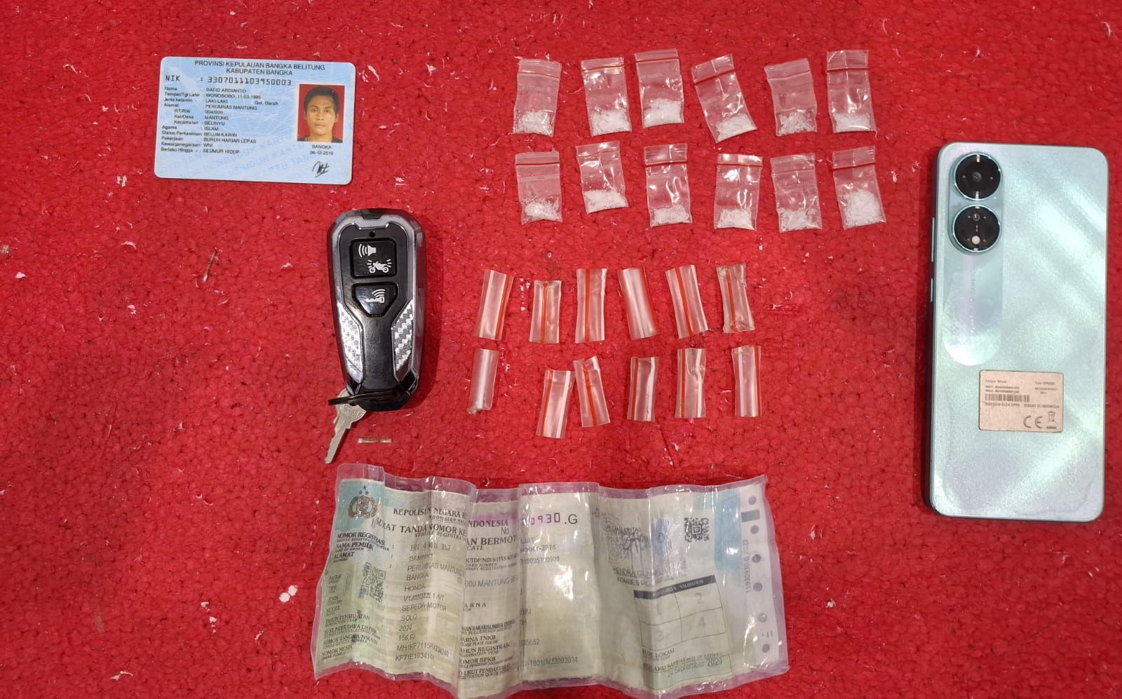 Dalam penggeledahan, Kata Akp Era, petugas menemukan sebuah telepon seluler merek Oppo A78 berwarna Aqua Green dan sepeda motor Honda PCX tanpa plat nomor yang diduga digunakan dalam operasi narkoba. Selain itu, DA mengaku menyimpan narkotika jenis sabu di dua lokasi berbeda di Belinyu, yakni Jalan Sincong, Gunung Muda, dan Dusun Bebek, Kelurahan Air Asam.