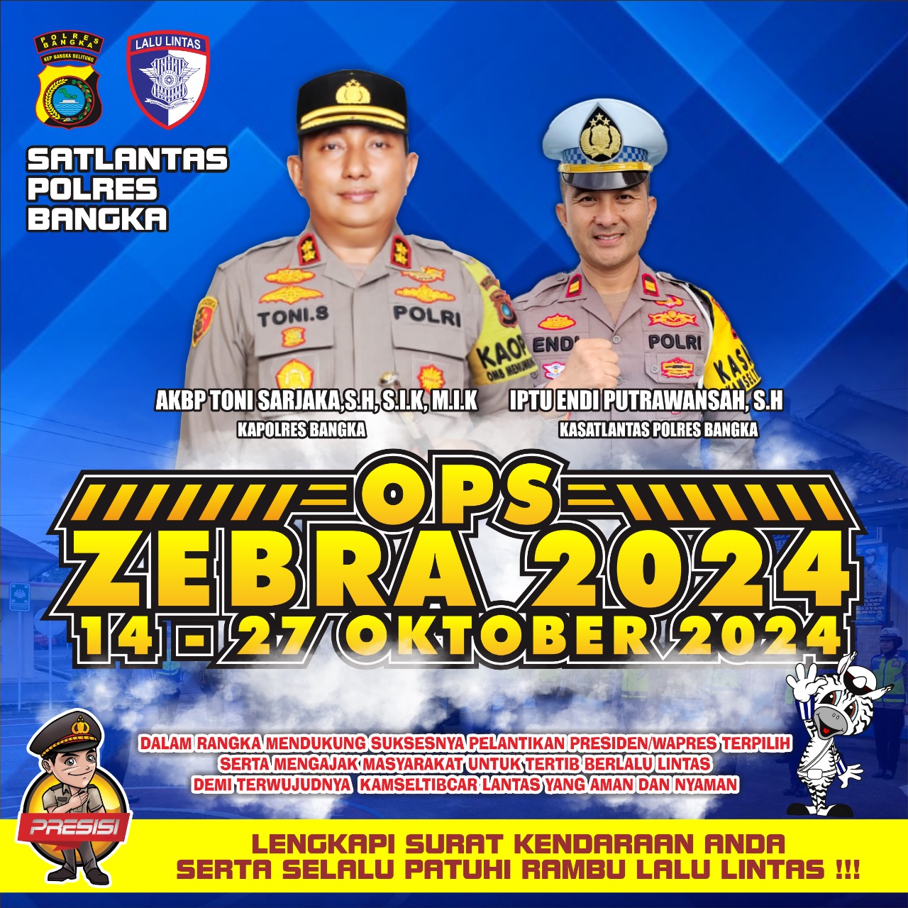 Kapolres Bangka melalui Kasat Lantas Iptu Endi Putrawansah, S.H., mengatakan Operasi Zebra ini dilaksanakan di Polda dan Polres Jajaran diseluruh Indonesia serta dilakukan secara terpusat.