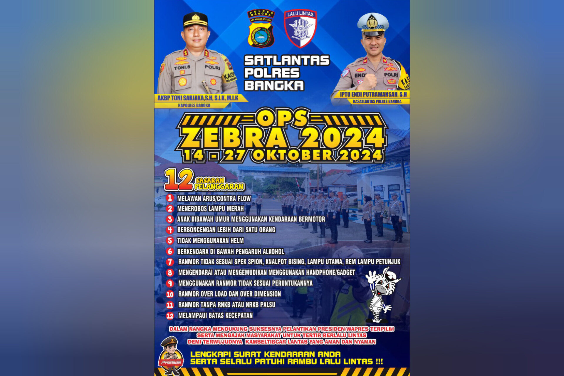 Kegiatan Operasi Zebra Menumbing 2024 Polres Bangka akan dilaksanakan selama 13 hari, pelaksanaannya mulai tanggal 14 hingga 27 Oktober 2024.