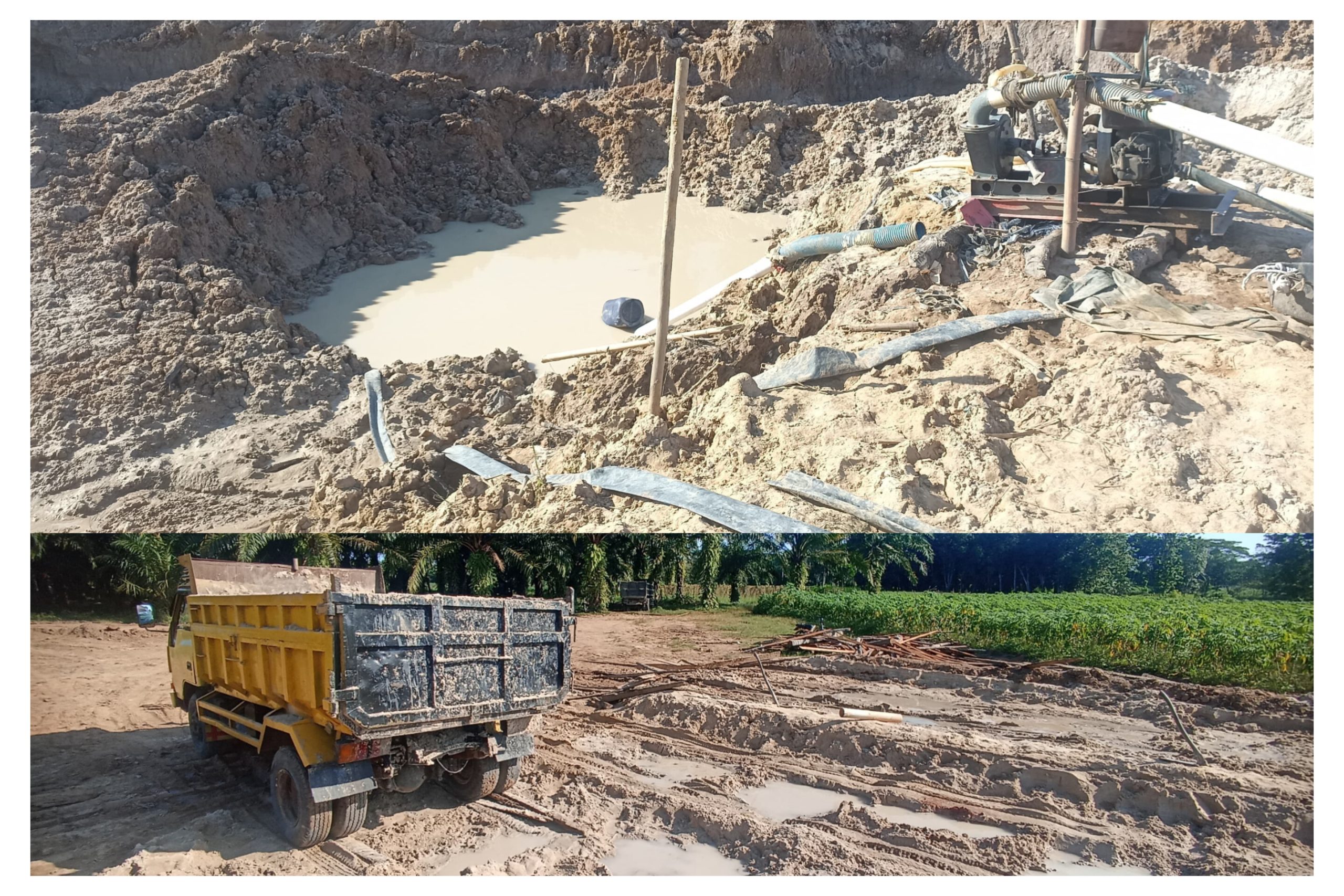 Selain terdapat Dua Unit kendaraan Dump Truk yang terparkir hendak melakukan Loading Muat Pasir, Tampak juga di lokasi penambangan 1 unit mesin besar dan 1 unit mesin berukuran kecil, yang diduga digunakan untuk melakukan penyedotan pasir, serta pipa paralon yang terjulur panjang dari mesin yang berada ditengah area pengerukan menuju tempat penampungan pasir hasil penyedotan.