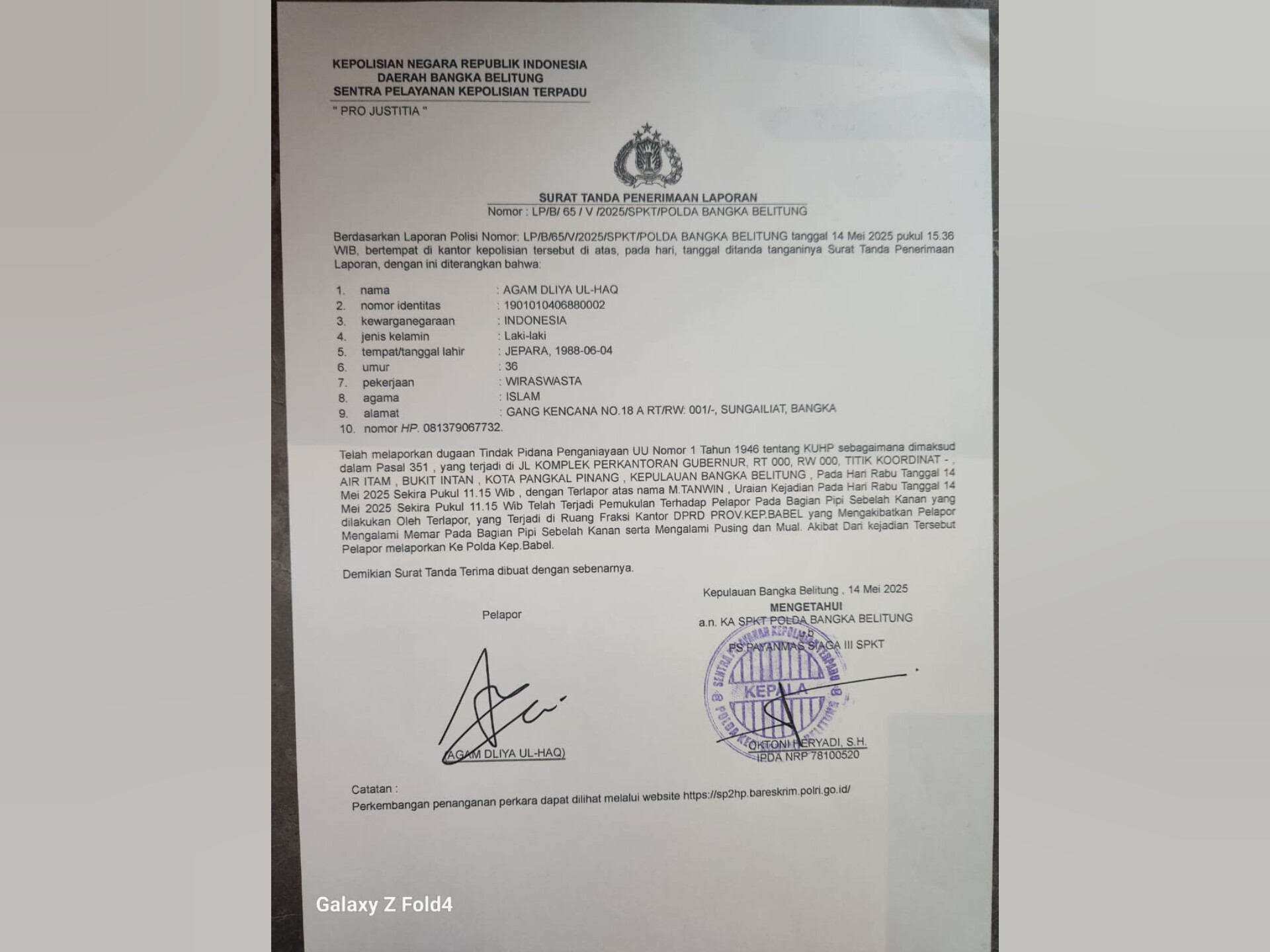 Surat Laporan Kepolisian Polda Babel (foto ; Istimewa)