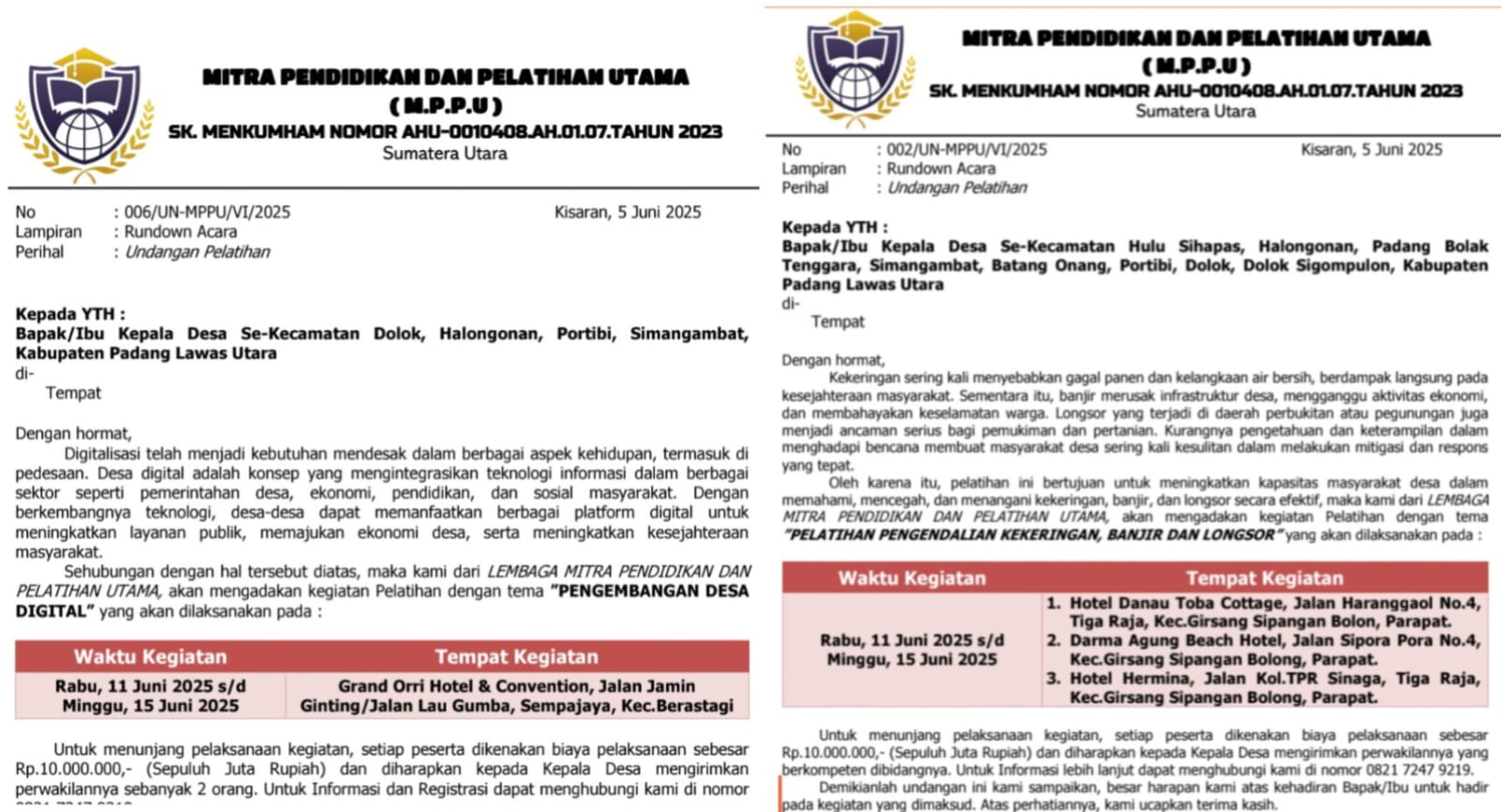 Seperti, Bimtek desa yang diselenggarakan oleh Lembaga Mitra Pendidikan dan Pelatihan Utama (MPPU) yang diketahui lewat undangan pelatihan kepada seluruh kepala desa yang ada di 8 kecamatan, Kabupaten Paluta baru-baru ini.