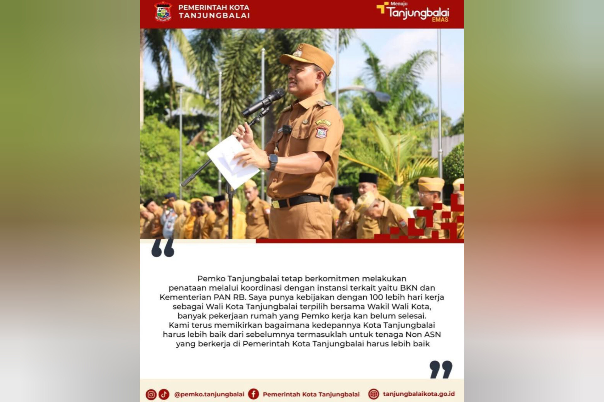 Dalam sambutannya, Wali Kota Tanjungbalai menjelaskan berdasarkan UU (Undang-Undang) Nomor 20 tahun 2023 tentang Aparatur Sipil Negara (ASN) pada Pasal 66 diamanahkan bahwa Pegawai Non ASN atau sebutan nama lainnya, wajib diselesaikan penataannya dan sejak UU ini dimulai berlaku instansi pemerintah dilarang mengangkat pegawai non ASN.