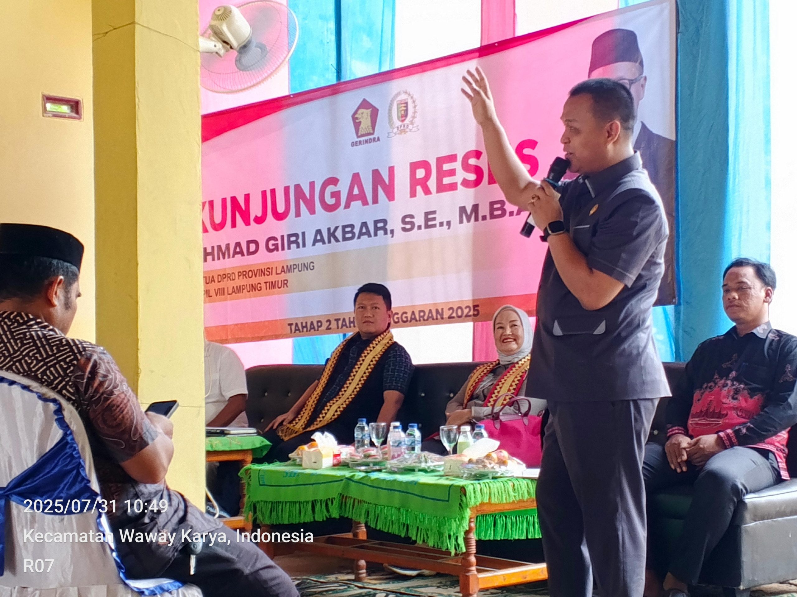 Lampung Timur| Jejakkriminal.com – Kegiatan Reses Tahunan yang dilaksanakan Wakil Ketua DPRD Kabupaten Lampung Timur Hanif Fauzi, S.E., M.H. dihadiri Anggota Komisi IV DPR-RI, ir. Dwita Ria Gunadi, M.Ikom. serta Ketua DPRD Provinsi Lampung, H. Ahmad Giri Akbar, S.E., M.B.A. pada Kamis (31/07/2025).
