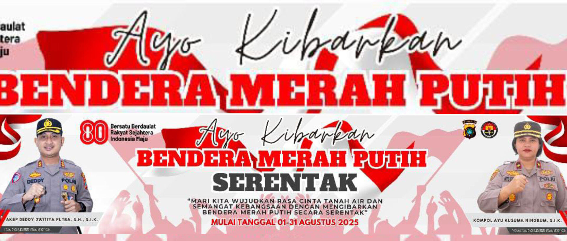 “Semarakkan lingkungan kita dengan nuansa merah putih. Tunjukkan kalau kita bangga jadi bagian dari bangsa Indonesia,” ujar AKBP Deddy