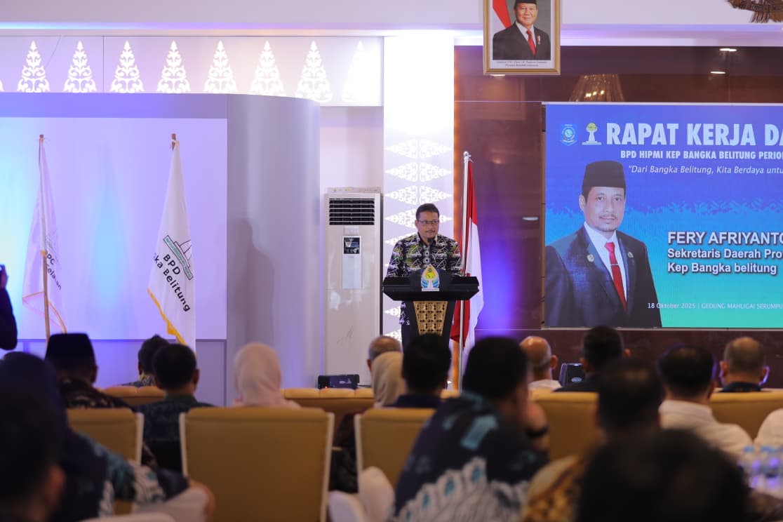 PANGKALPINANG | Jejakkriminal.com – Gubernur Kepulauan Bangka Belitung (Babel), Hidayat Arsani melalui Pj Sekretaris Daerah (Sekda) Fery Afriyanto berkesempatan hadir sekaligus membuka Rapat Kerja Daerah (Rakerda) Badan Pengurus Daerah (BPD) Himpunan Pengusaha Muda Indonesia (HIPMI) Babel yang berlangsung pada Sabtu (18/10/2025) di Gedung Mahligai Rumah Dinas Gubernur.