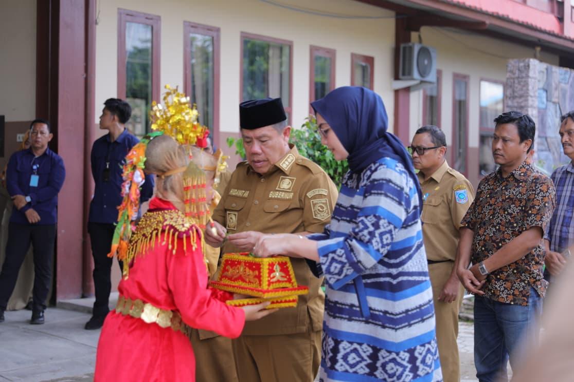 Setibanya, di halaman SMAN 1 Mentok, Gubernur Hidayat beserta rombongan, langsung disuguhi dengan Tari Sambut dari perwakilan peserta didik SMAN 1 Muntok beserta Kepala Sekolah dan para guru.