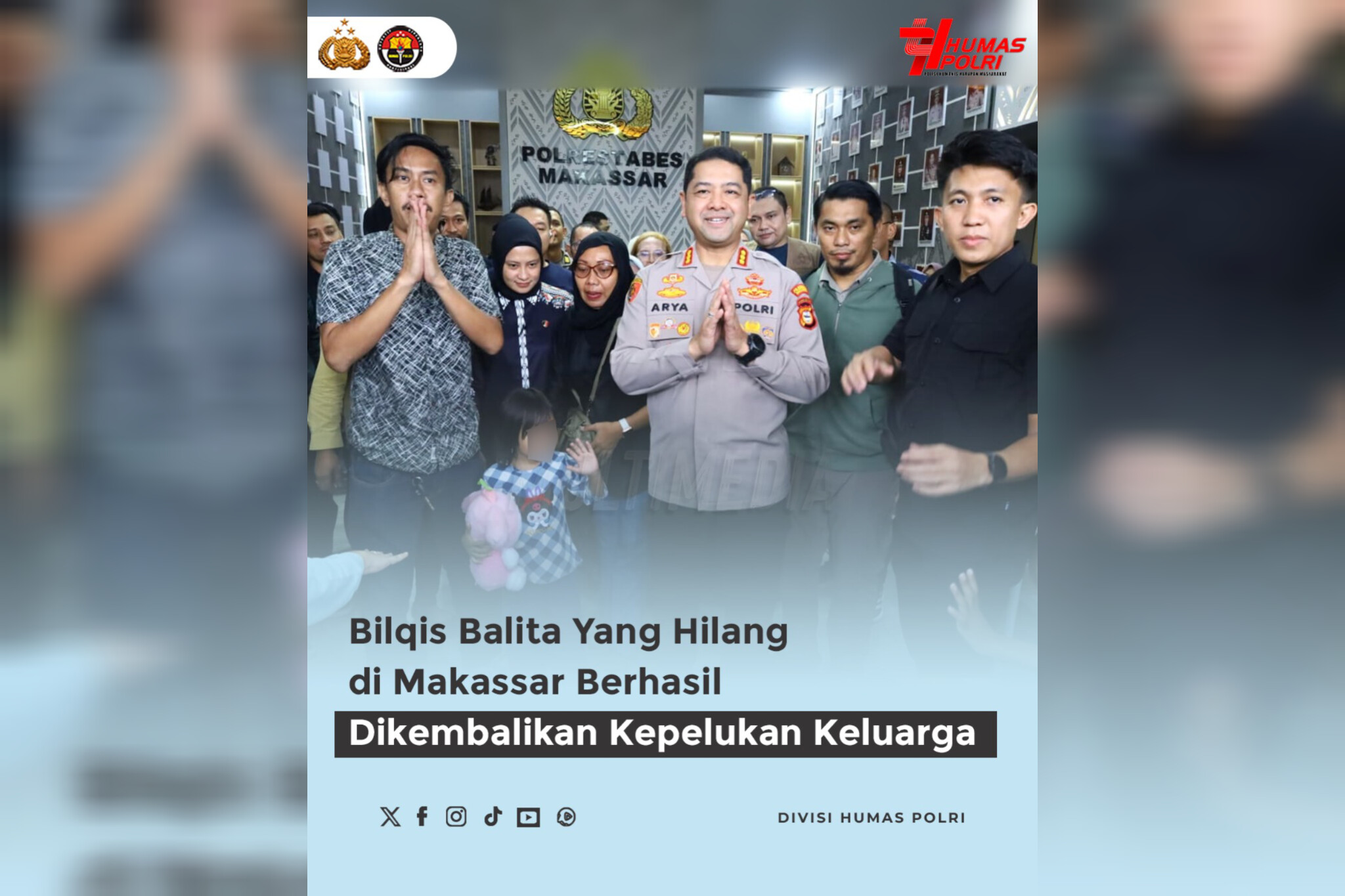 Makassar | Jejakkriminal.com- Polri berhasil menemukan dan memulangkan Bilqis (4), balita yang sempat dilaporkan hilang di Taman Pakui Sayang, Jalan A.P. Pettarani, Makassar, pada Minggu (2/11).