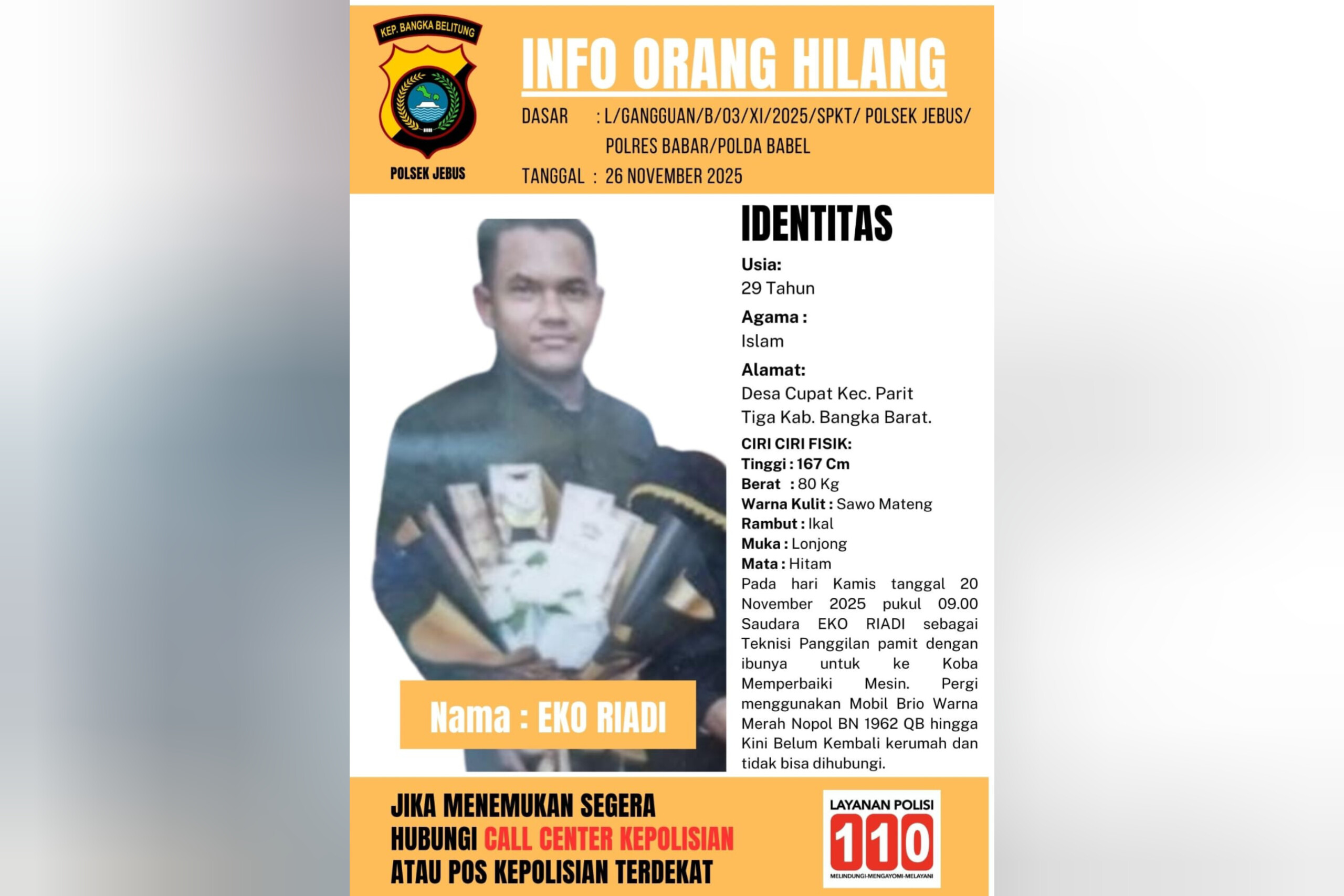 Bangka Barat | Jejakkriminal.com- Polres Bangka Barat melalui Polsek Jebus bergerak cepat menindaklanjuti laporan hilangnya Eko Riadi, warga Desa Cupat Kecamatan Jebus, yang tidak pulang sejak Kamis, 20 November 2025. Laporan resmi disampaikan keluarga pada Rabu (26/11/2025) setelah korban tidak dapat dihubungi maupun ditemukan keberadaannya.
