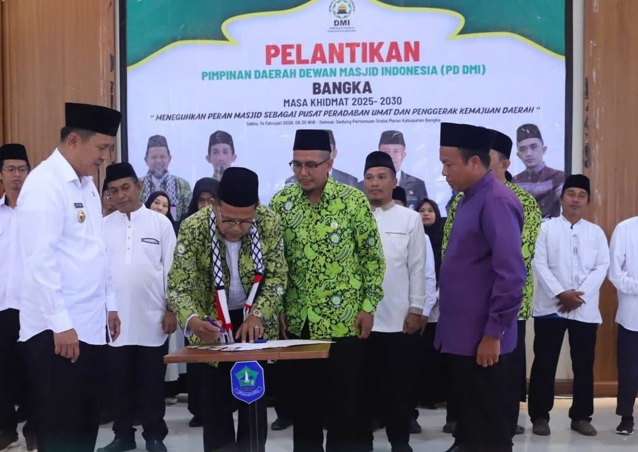 Sungailiat | JejakKriminal.com — Bupati Bangka Fery Insani SE,MM manghadiri acara pelantikan Pimpinan Pengurus Daerah Dewan Masjid Indonesia (PD DMI) Kabupaten Bangka untuk masa khidmat 2025–2030,yang di nahkodai Imam Santoso beserta pelantikan jajaran pengurus (PD DMI) Kabupaten Bangka yang digelar di Graha Maras, lingkungan Sekretariat Bupati Bangka, Sabtu (14/2/2026).